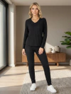 La blusa de manga larga con cuello en V aporta un acabado favorecedor y versátil, mientras que el pantalón de ajuste cómodo acompaña el movimiento sin apretar ni marcar. Es un set pensado para el uso diario, ideal para quienes buscan practicidad con una imagen cuidada.
